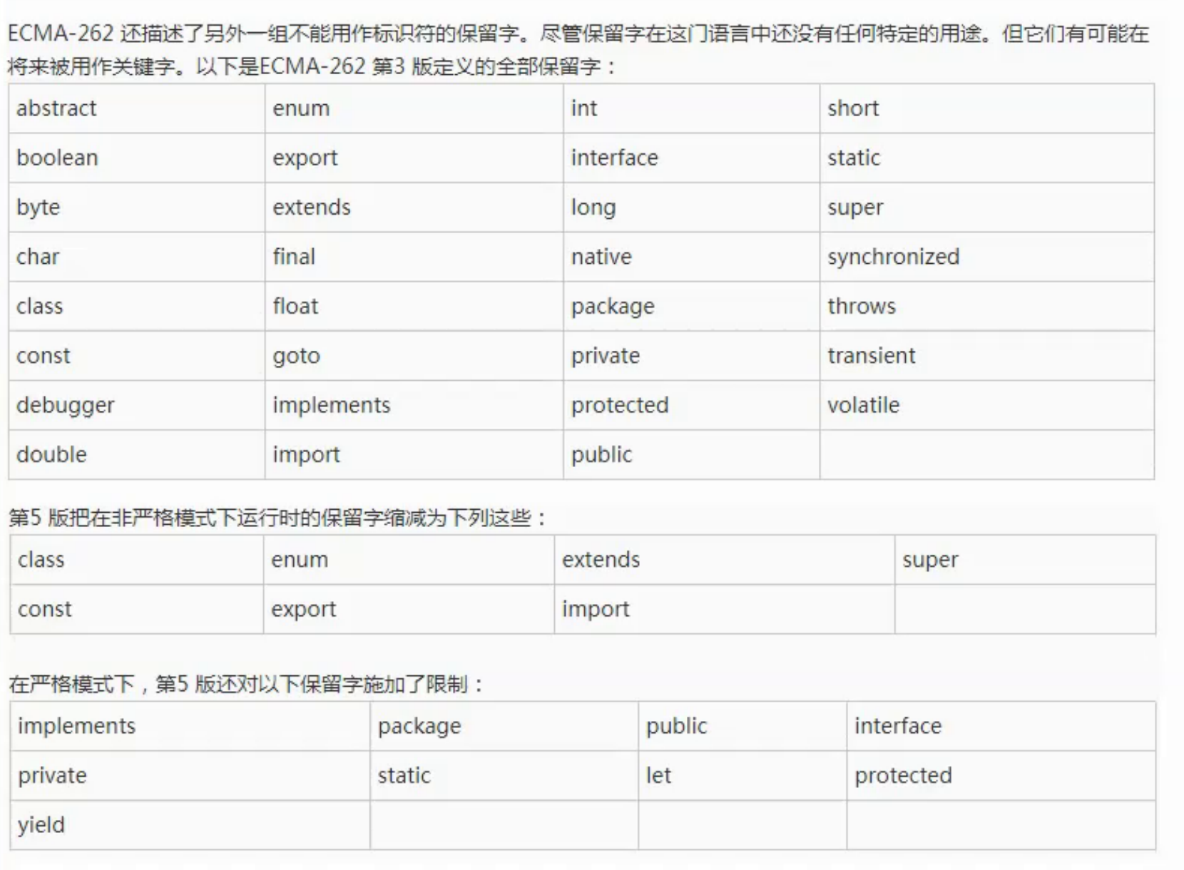 不能使用关键字和保留字:在 JS 中有特殊含义的叫做关键词,未来可能会成为关键字的叫做保留字