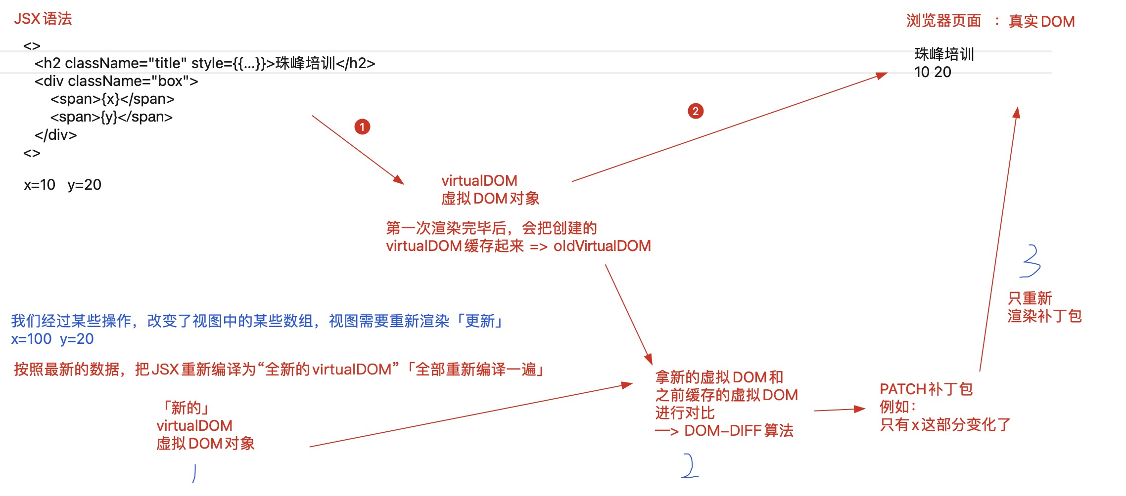 补充说明:第一次渲染页面是直接从 virtualDOM->真实 DOM;但是后期视图更新的时候,需要经过一个 DOM-DIFF 的对比,计算出补丁包 PATCH(两次视图差异的部分),把 PATCH 补丁包进行渲染!!