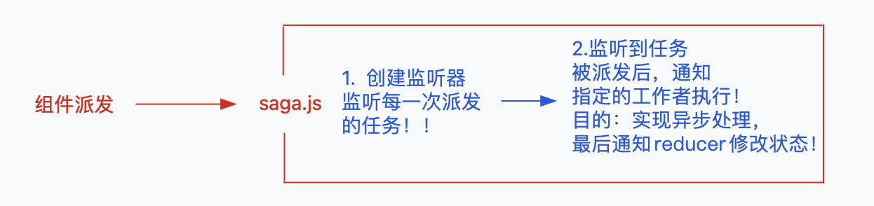 redux-saga中提供了一系列的api,可以去监听纯粹对象格式的action,方便单元测试!! action1 ———> redux-saga监听 ———> 执行提供的API方法 ———> 返回描述对象 ———> 执行异步操作 ———> action2 ———> reducer ———> state